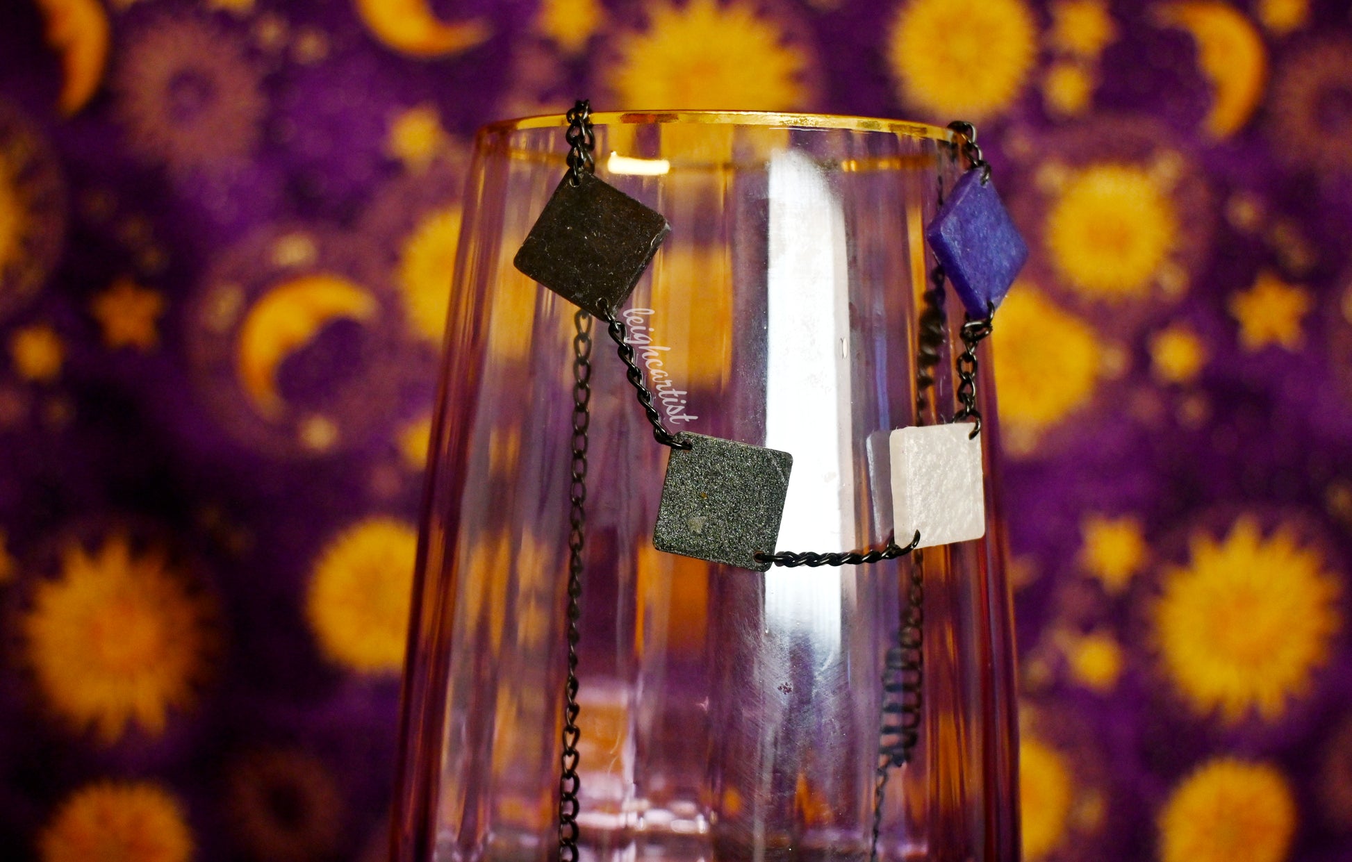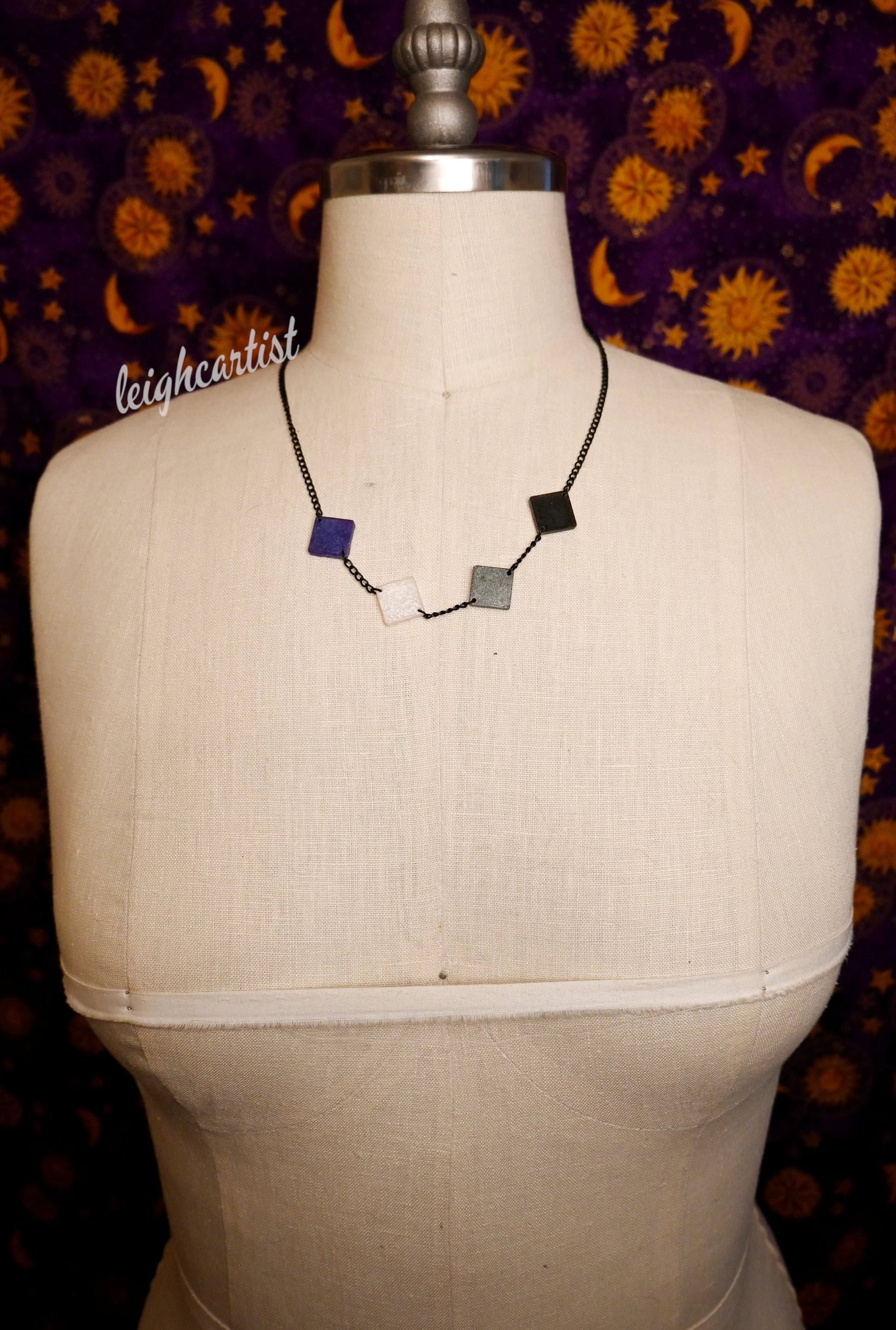 Part of my year-round Pride collection. This understated necklace simply but effectively states your asexual pride. Each diamond-shaped resin charm is a different color of the ace flag, and the black chain matches with the dark colors of the flag. It's simple, chic, and proud!