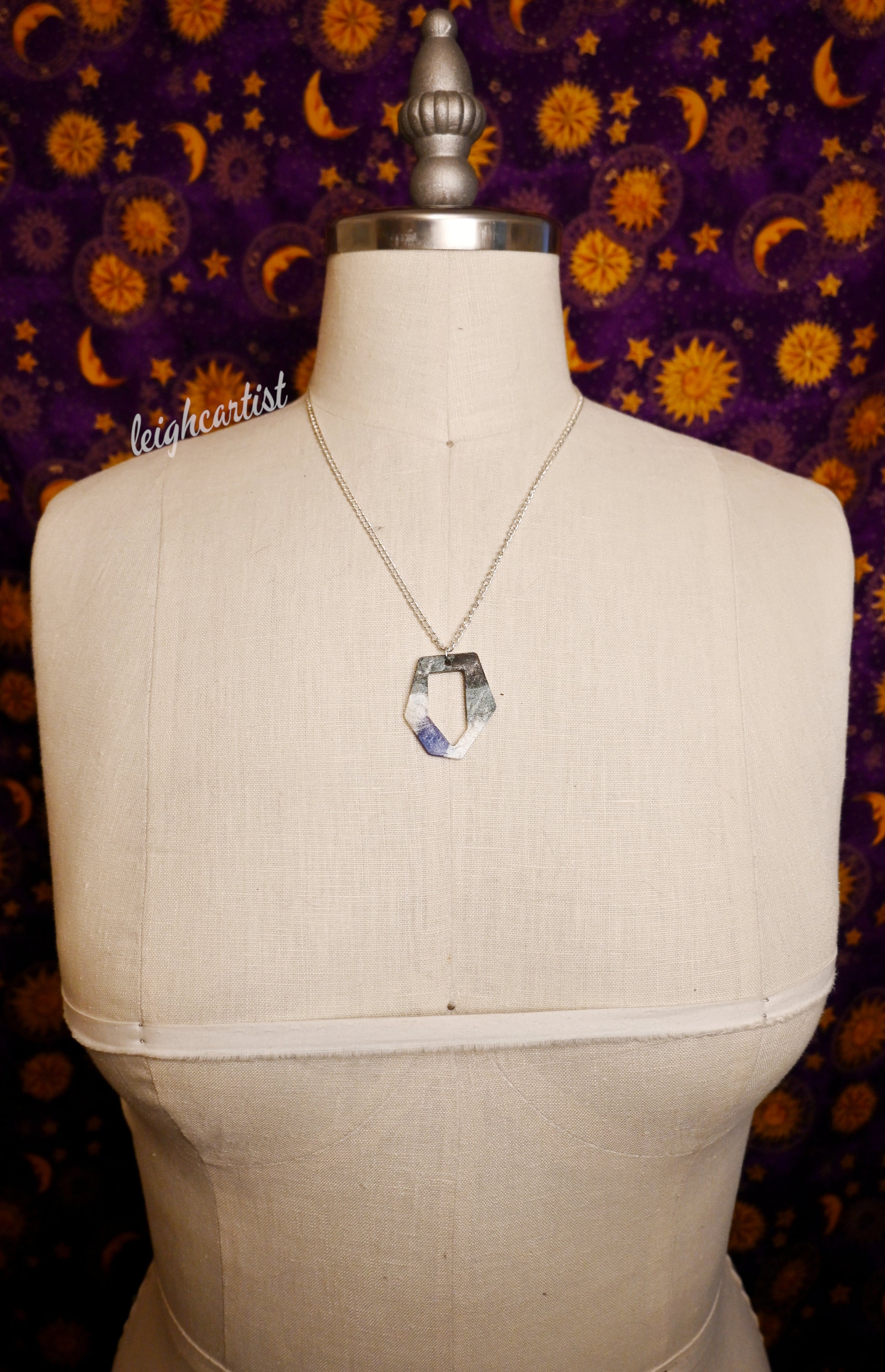 Part of my year-round Pride collection. This one is a more subtle nod to the flag it represents, in case you want or need to be a bit covert about your ace identity. The funky geometric pendant features the colors of the asexual flag, but in such a way that to the average viewer it might just look like a dark color scheme. But to those in the know, there's a lot more to it than just a simple necklace!