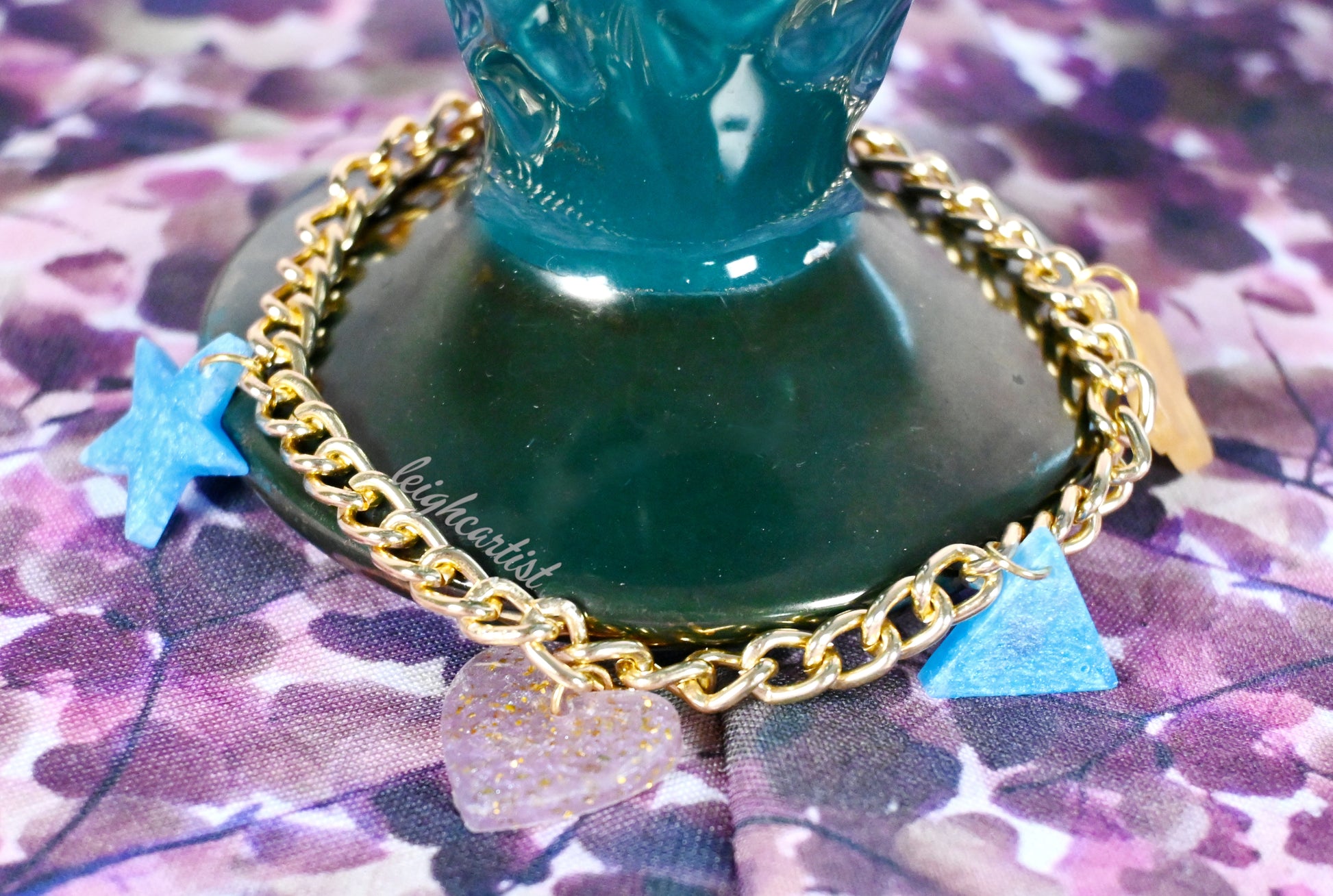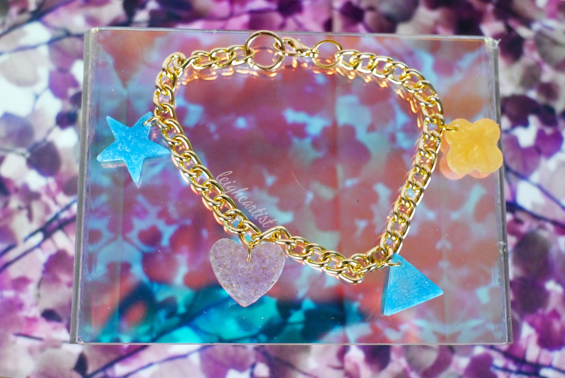 This adorable charm bracelet will have you feeling over the moon! Featuring: a purple heart with gold glitter; a shimmery blue star; a partly-clear blue triangle; and a gold cloud.