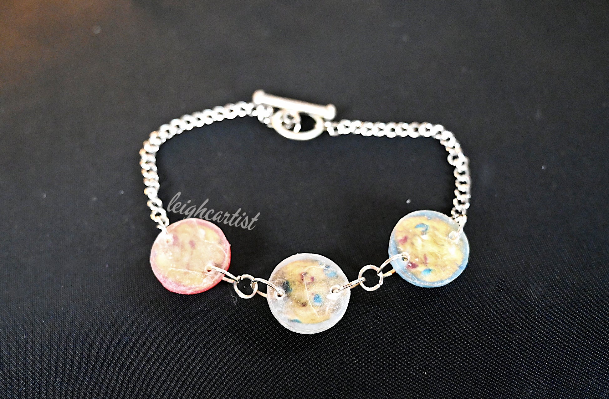 Treat yourself to something tasty this 4th of July. This bracelet features three round resin charms, each showing a cookie with red white and blue chocolate chips. The charms, made by sandwiching pieces of photos between layers of resin, are each backed with red, white, and blue pigment, respectively.