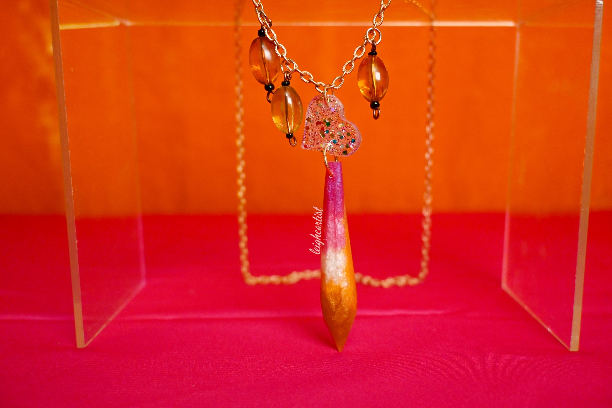 Part of my year-round Pride collection. Celebrate the magic of lesbian love with this resin crystal necklace! The colors of the lesbian flag swirl through the crystal pendant, which is framed by warm-colored glass beads. A heart pendant filled with multicolored glitter, and rose gold hardware, finish off the look.