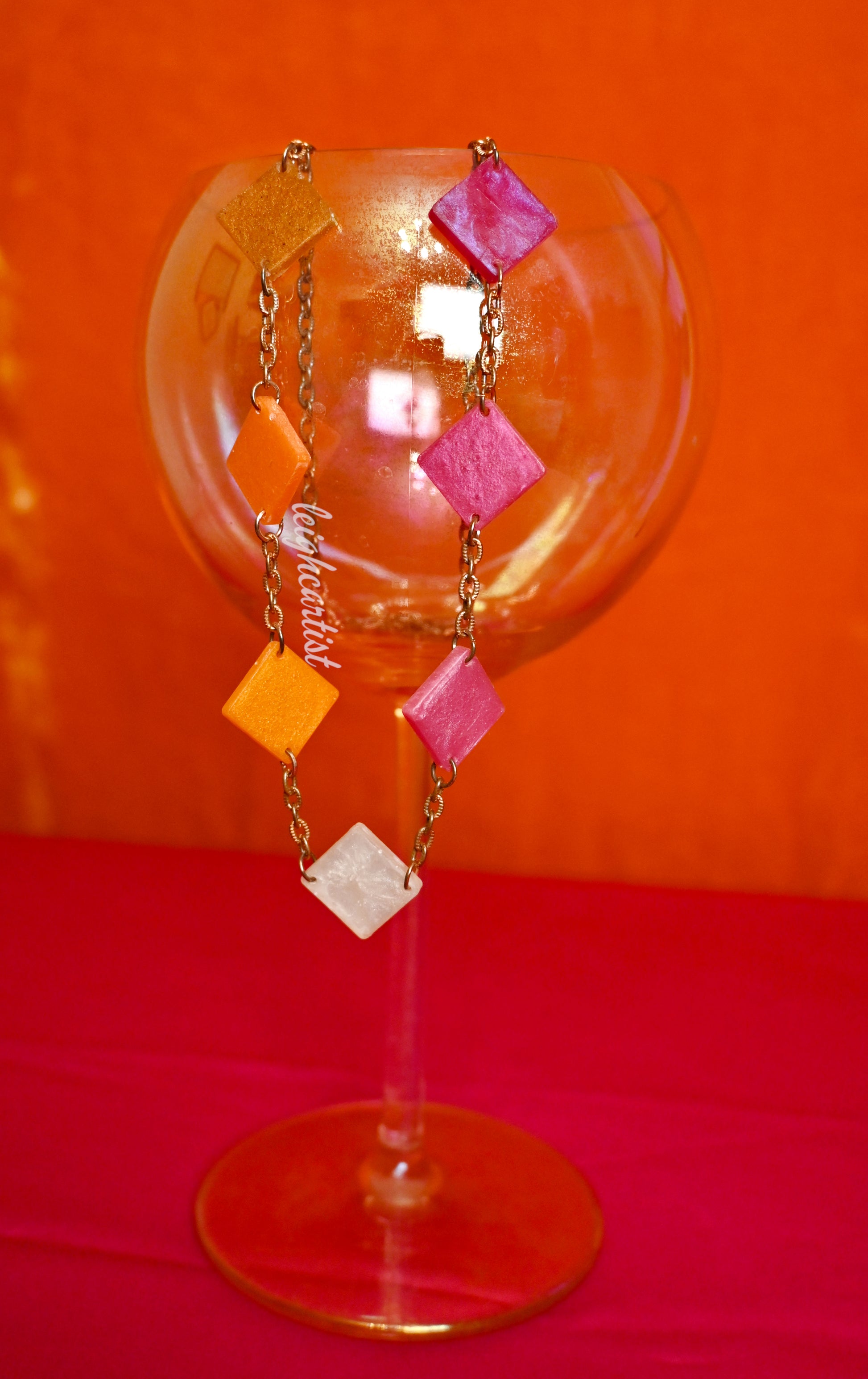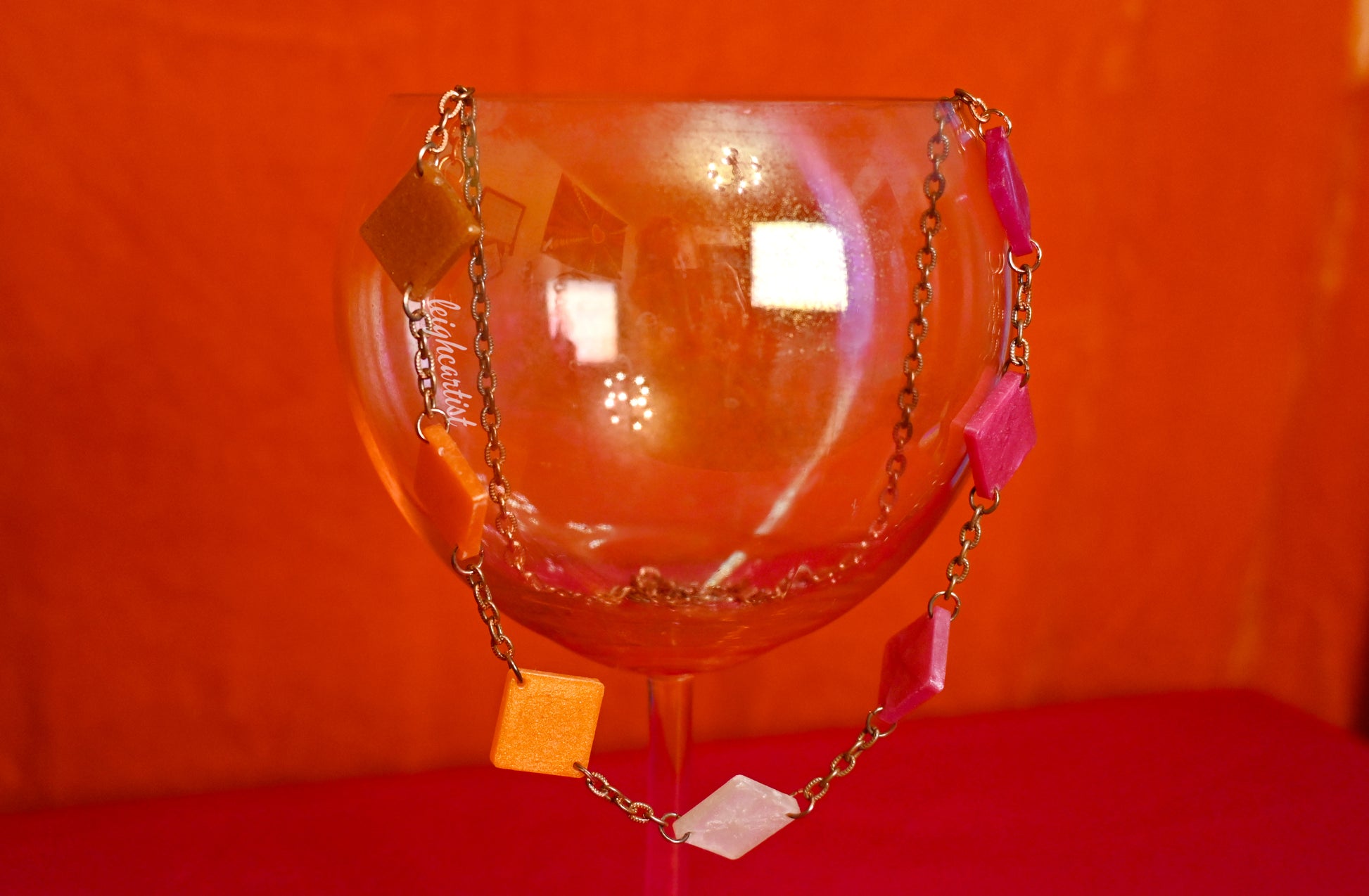 Part of my year-round Pride collection. This understated necklace simply but effectively states your lesbian pride. Each diamond-shaped resin charm is a different color of the lesbian flag, and the rose gold chain matches with the warm tones of the flag. It's simple, chic, and proud!