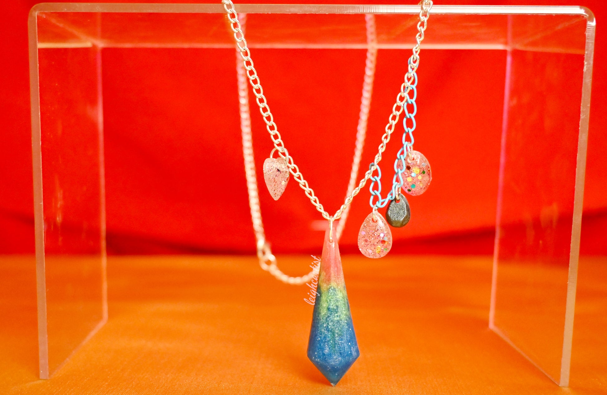 Part of my year-round Pride collection. Celebrate your pansexual magic with this resin crystal necklace! The colors of the pansexual flag swirl through the crystal pendant, which is surrounded by small glittery gemstones. Three of the gems hang from a bright blue chain for an extra bit of fun.